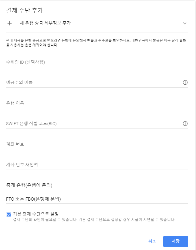 새 은행 송긍 세부정보 추가 버튼을 클릭하면 아래와 같이 저희가 채울게 생기는데 수취인ID는 입력 안하셔도 됩니다.