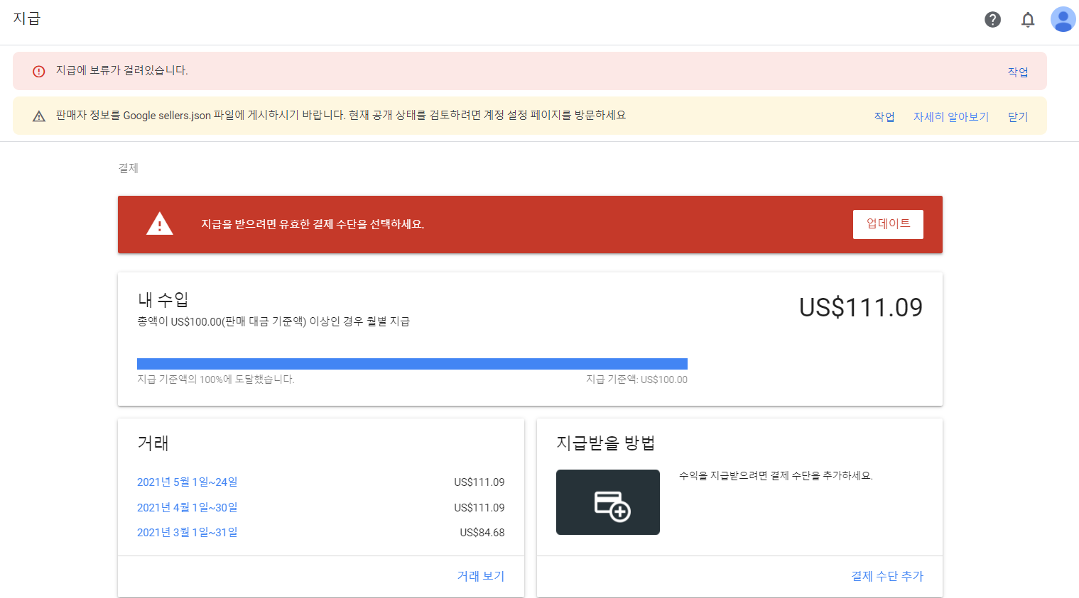 100$ 이상일 경우 지급 신청이 가능합니다. 우선 지급 받기 전에 위 스샷에 작업을 클릭해주세요.