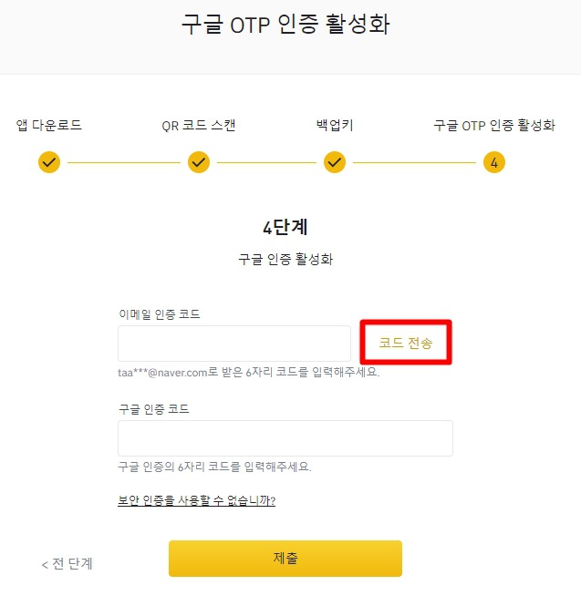 마지막 4단계는 코드전송을 눌러 이메일로 날아온 인증코드를 입력하고, 구글 OTP의 6자리 인증번호를 입력후 제출하면 모든것이 완료됩니다.