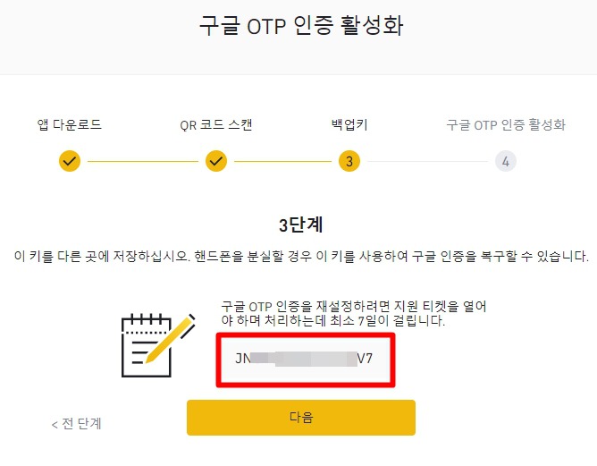 3단계는 매우 중요합니다. 백업키를 꼭 어딘가에 기록, 저장해두는 것이 좋습니다. 저 백업키를 잃어버리면 피곤해집니다.
