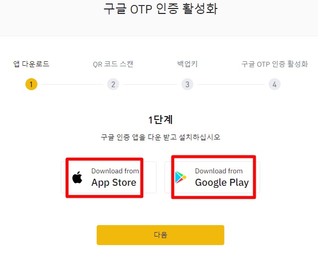 폰이나 태블릿에 구글 OTP를 설치한 후 다음을 누르고 2단계를 계속 진행합니다.